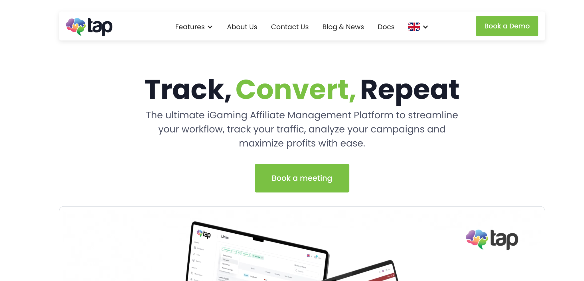 Key features include API integrations for seamless reporting and custom registrations, A/B testing, personalized communication, media optimization, and multi-product commissions. With support for any language, dedicated success managers, and tools like Refer-a-Friend to turn players into affiliates, TAP drives growth with impressive stats: over 30 million daily clicks, 1 million registrations, and 1.6 million affiliates.