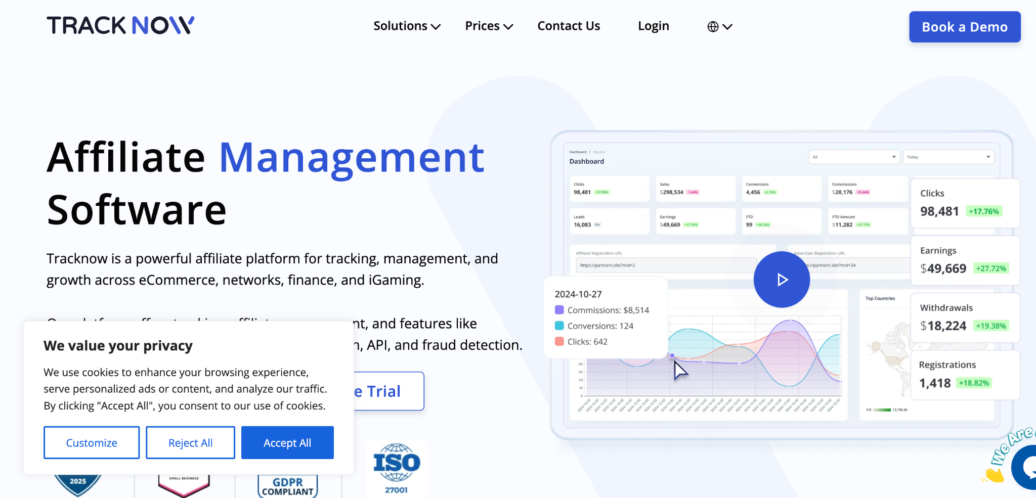 Tracknow ranks among the best casino affiliate platforms in 2026, delivering flexible performance marketing tools for casino and sportsbook operators worldwide. It excels in real-time reporting, custom commission logic, and integrations, supporting CPA, RevShare, and Hybrid models for global scalability. The platform's clean interface offers advanced analytics on conversions, player acquisition, and fraud prevention, with multi-geo and multi-brand capabilities.