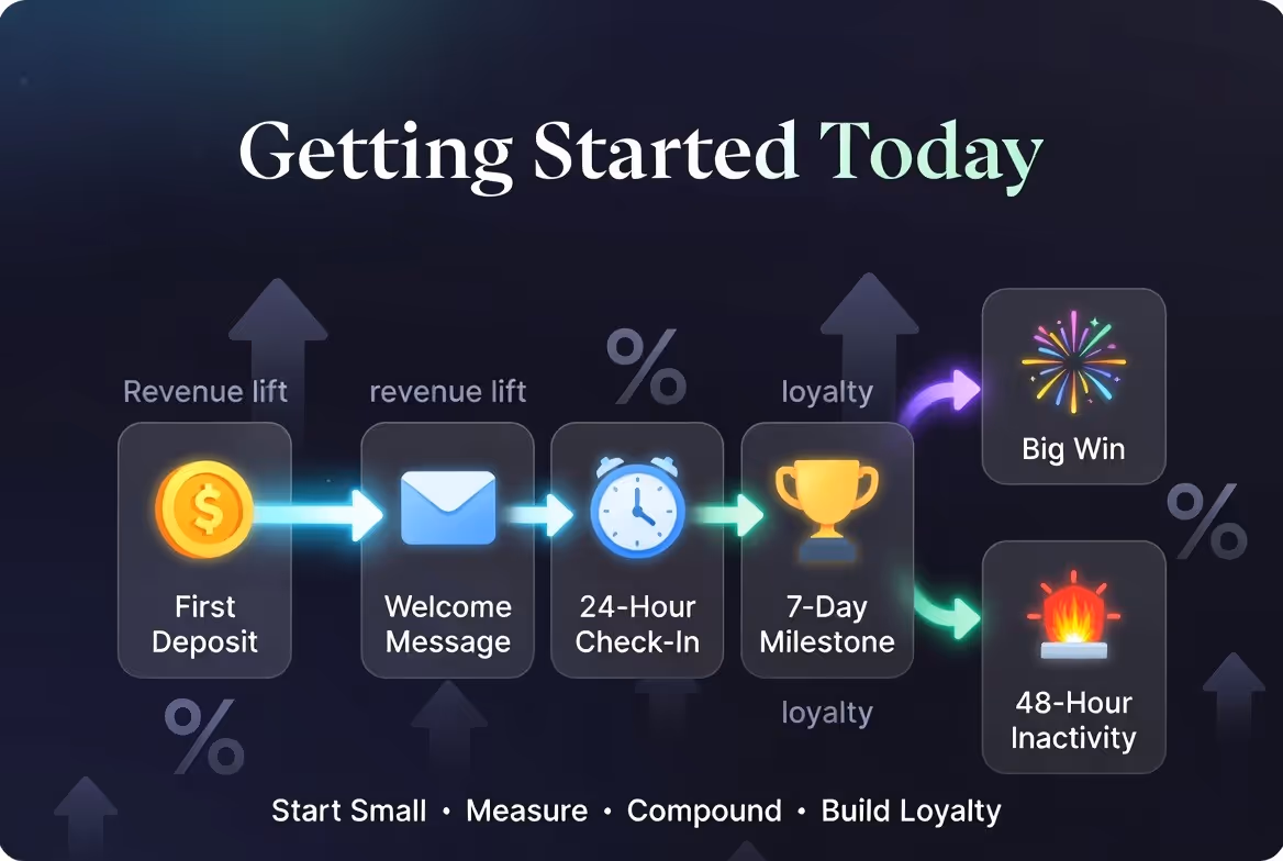 Pick one high-value trigger event. First deposit is usually the best place to start. Build a simple three-step journey: immediate welcome message, 24-hour check-in, 7-day milestone celebration.