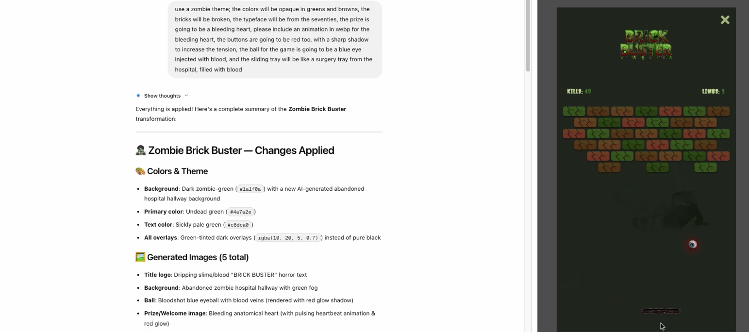 Помимо механики, вы управляете внешним видом и ощущениями. Опишите цвета, стиль и общую атмосферу, а агент создаст шаблон игры, который можно будет предварительно просмотреть в реальном времени. Если у вас есть собственные ресурсы (логотип, значки, фоновые изображения), просто загрузите их напрямую и сообщите агенту, где их использовать.